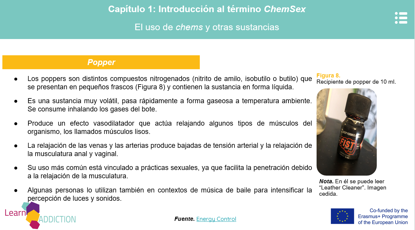 El material señala que el uso de poppers se asocia a un “aumento del riesgo de contraer el VIH o ITS”, debido tanto a la desinhibición como al efecto vasodilatador que puede facilitar microlesiones y sangrado.